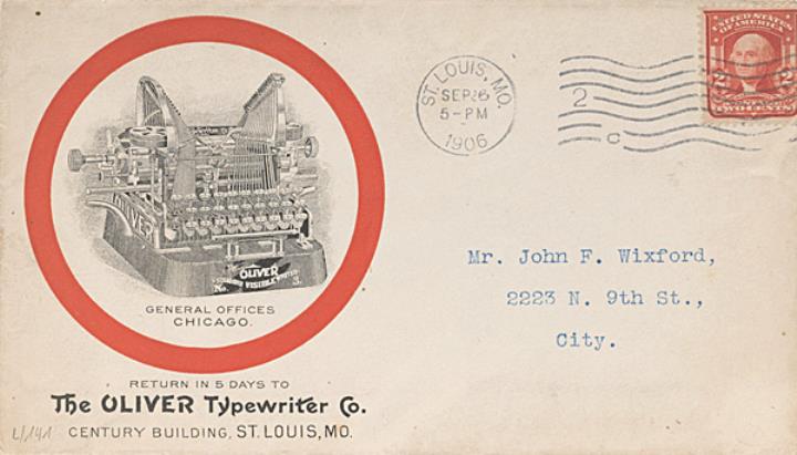 Briefumschlag mit Firmendruck der Oliver Typewriter Company adressiert (Maschinenschrift) an Mr. Wixford, St. Louis; Briefmarke U.S. Postage Two Cents; Poststempel St. Louis/Sep 26 1906