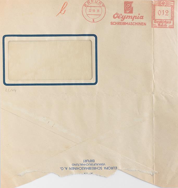 Briefumschlag mit Absenderfreistempel des Schreibmaschinenherstellers Olympia Stempel: Erfurt/22.10.1936, Werbung Olympia, Wert Deutsches Reich 12 RPf.