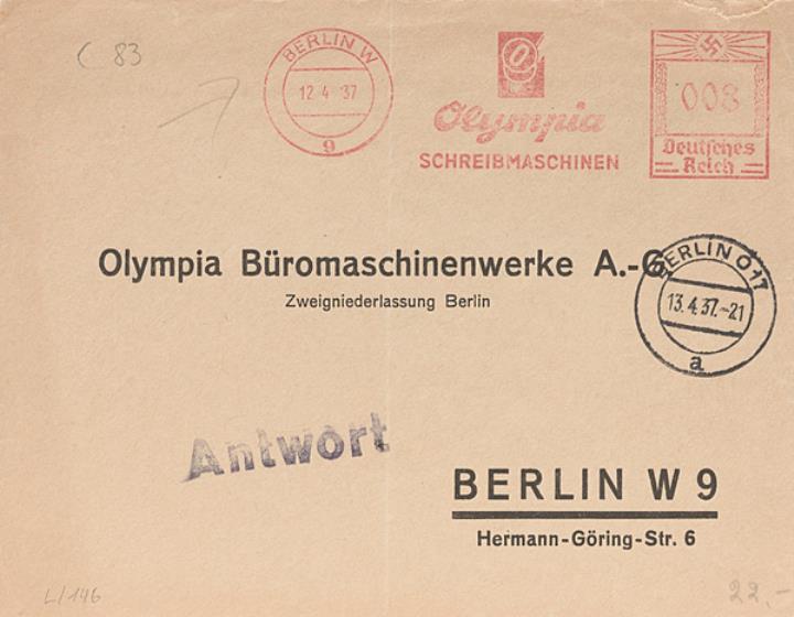 Briefumschlag mit vorgedruckter Anschrift und Absenderfreistempel des Schreibmaschinenherstellers Olympia Stempel: Berlin/12.04.1939, Werbung Olympia Schreibmaschinen, Wert Deutsches Reich 8 RPf.