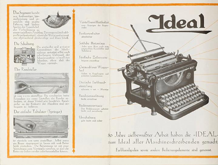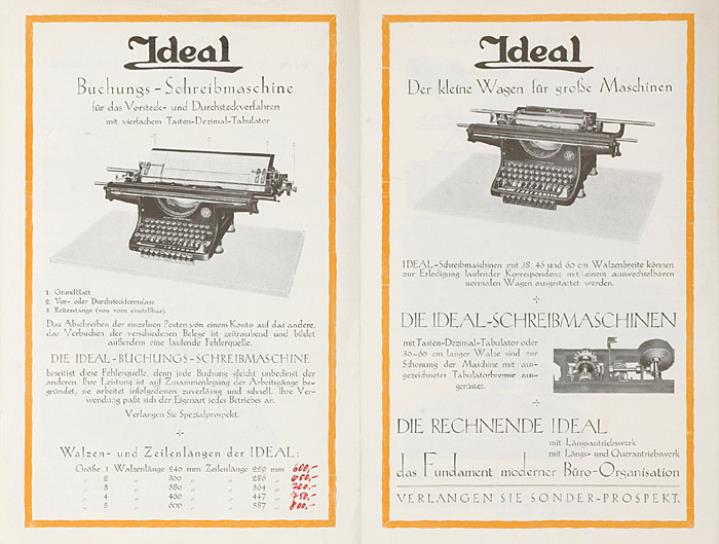 Faltprospekt für Schreibmaschine Ideal; Nr. S 708 g yf. TEX Beilage: Preisliste gültig ab 1. August 1932; Nr. Sv5259 a py P Grafik: FM Fedar