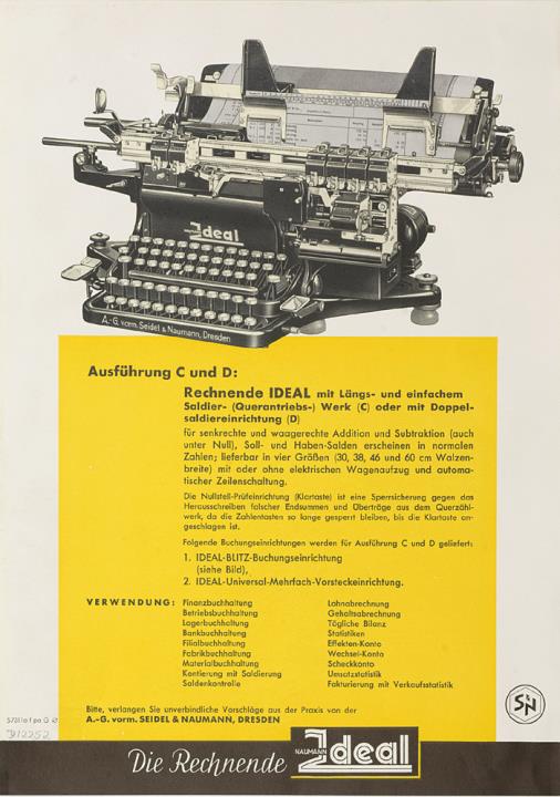 Prospekt für Schreib- und Buchungsmaschine Ideal mit Längs- und einfachem Saldier- (Querantriebs-) Werk (C) oder mit Doppelsaldiereinrichtung (D) Nr. S 7311a f pa G