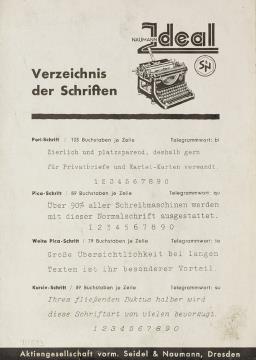 Prospekt für Schreibmaschine Ideal, Schriftarten und Tastaturen Nr. 946.11.20.5.10 Druck: Leutert & Schneidewind Dresden