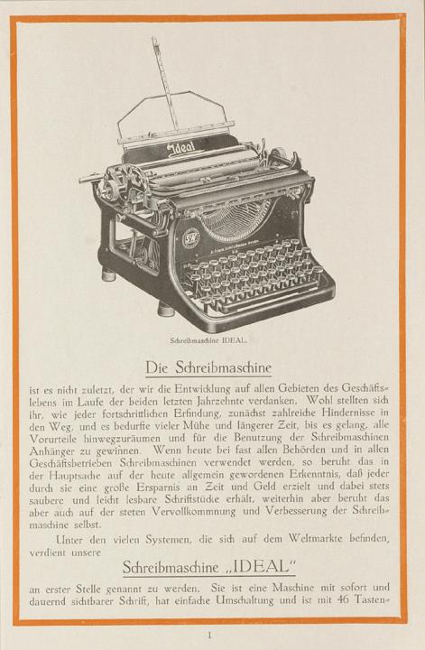 Next to literature on the history of technology, of the typewriter and the office, the Archive holds patent letters, textbooks and instruction manuals as well as historical postcards, letters, photographs and various kinds of advertising (leaflets and brochures, advertising stamps, newspaper ads, posters and signs, promotional gifts).