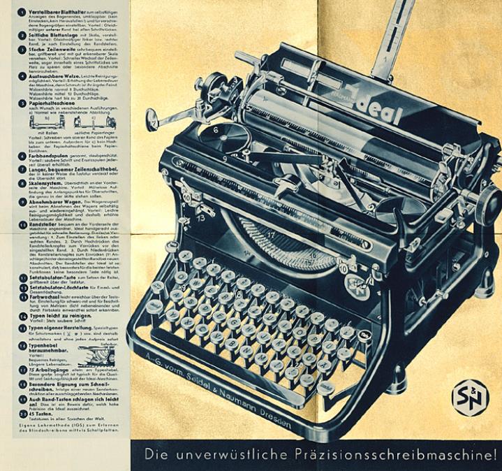 Faltprospekt für Schreibmaschine Ideal Hohe Schreibschnelligkeit. Sehr leichter Anschlag. Große Durchschlagskraft Nr. S 7129a.po.PEX.