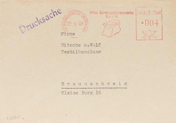 Briefumschlag mit Absenderfreistempel der Orbis Büromaschinenwerke adressiert (Maschinenschrift) an Firma Nitsche u. Wolf, Braunschweig Stempel: Wilhelmshaven/27.05.1949, Werbung Orbis, Wert Deutsche Post 4 Pf.