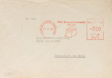 Briefumschlag mit Absenderfreistempel der Orbis Büromaschinenwerke adressiert (Maschinenschrift) an Kommentator-Verlag, Frankfurt Stempel: Wilhelmshaven/14.06.1949, Werbung Orbis, Wert Deutsche Post 20 Pf.
