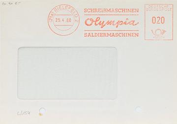 Vorderseite eines Briefumschlags mit Absenderfreistempel des Schreibmaschinenherstellers Olympia Stempel: Bielefeld/25.04.1960, Werbung Olympia, Wert Deutsche Bundespost 20 Pf.