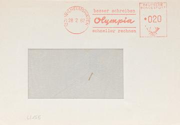 Briefumschlag mit Absenderfreistempel des Schreibmaschinenherstellers Olympia Stempel: Wilhelmshaven/28.02.62, Werbung Olympia, Wert Deutsche Bundespost 20 Pf.