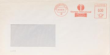 Briefumschlag mit Absenderfreistempel des Schreibmaschinenherstellers Olympia adressiert an Olympia Werke AG, Hamburg Stempel: Werbung Olympia, datiert Essen-Altenessen/14.07.1967, Wert Deutsche Bundespost 30 Pf.