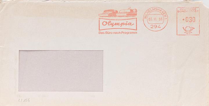 Briefumschlag mit Absenderfreistempel des Schreibmaschinenherstellers Olympia Stempel: Wilhelmshaven/03.11.1966, Werbung Olympia, Wert Deutsche Bundespost 30 Pf.