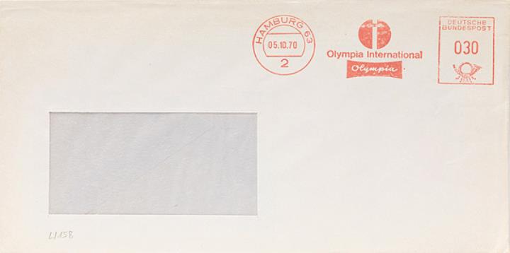 Briefumschlag mit Absenderfreistempel des Schreibmaschinenherstellers Olympia adressiert an Olympia Werke AG, Hamburg Stempel: Werbung Olympia, datiert Essen-Altenessen/14.07.1967, Wert Deutsche Bundespost 30 Pf.