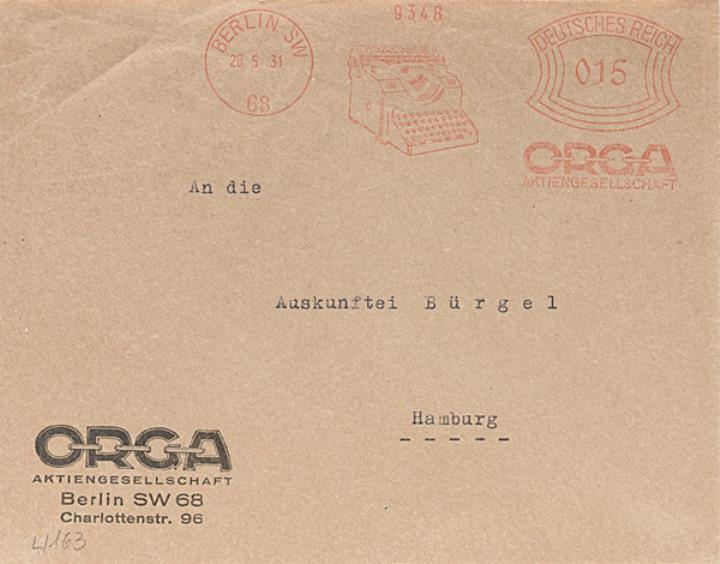 Briefumschlag mit Firmendruck und Absenderfreistempel des Schreibmaschinenherstellers Orga; Nr. 9348 adressiert (Maschinenschrift) an Auskunftei Bürgel, Hamburg Stempel: Berlin/26.05.1931, Werbung Orga Privat, Wert Deutsches Reich 15 RPf.