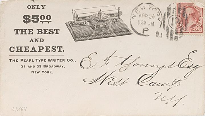 Briefumschlag mit Firmendruck der Pearl Typewriter Co. adressiert (Handschrift); Briefmarke U.S. Postage 2 Cents; Poststempel New York/Apr 24 91