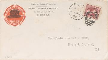 Briefumschlag mit Firmendruck der Wyckoff, Seamans & Benedict, Chicago adressiert (Maschinenschrift) an Manufacturers Nat'l Bank, Rockford; Briefmarke U.S. Postage 2 Cents; Poststempel Chicago/Apr xx 1890