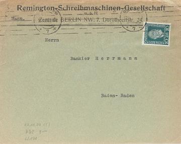 Briefumschlag mit Firmendruck der Remington Schreibmaschinengesellschaft adressiert (Maschinenschrift) an Herrn Herrmann, Baden-Baden; Briefmarke Deutsches Reich 10 RPf.; Poststempel Berlin/22.11.1924