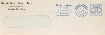 Vorderseite eines Briefumschlags mit Firmendruck und Absenderfreistempel der Remington Rand Inc. Stempel: Werbung Remington Noiseless, datiert Tonawanda/Jul 12 1935, Wert U.S. Postage 3c