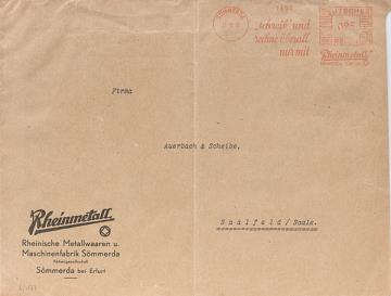 Briefumschlag mit Firmendruck und Absenderfreistempel des Schreibmaschinenherstellers Rheinmetall Stempel: Sömmerda/06.09.1935, Werbung Rheinmetall Büromaschinen, Wert Deutsches Reich 12 RPf