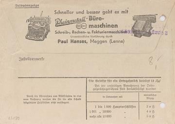 Postsachenumschlag (Fernsprechrechnung) mit rückseitigem Werbedruck für Büromaschinen Rheinmetall adressiert an Fa. Böse & Co., Hachen; Poststempel Hachen/21.09.1939