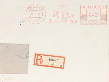 Fragment Briefumschlag mit Absenderfreistempel des Schreibmaschinenherstellers Royal Stempel: Berlin/18.02.1936, Werbung Royal, Wert Deutsches Reich 42 RPf