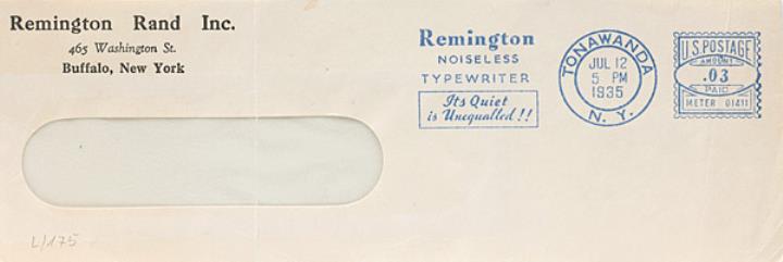 Vorderseite eines Briefumschlags mit Firmendruck und Absenderfreistempel der Remington Rand Inc. Stempel: Werbung Remington Noiseless, datiert Tonawanda/Jul 12 1935, Wert U.S. Postage 3c