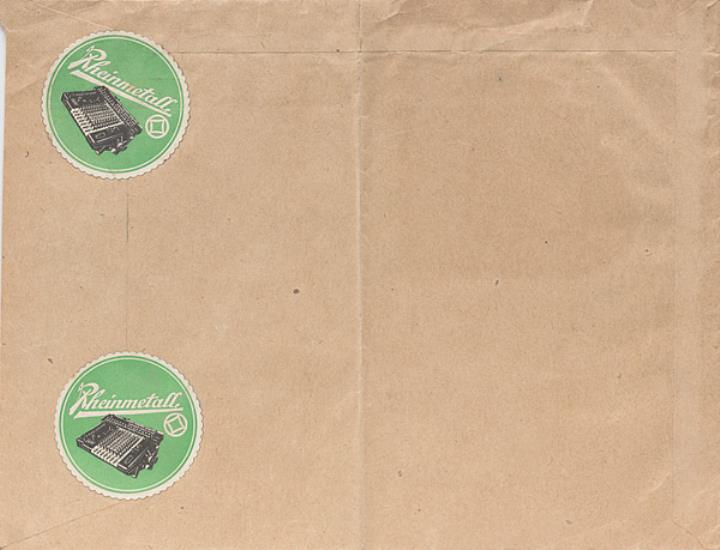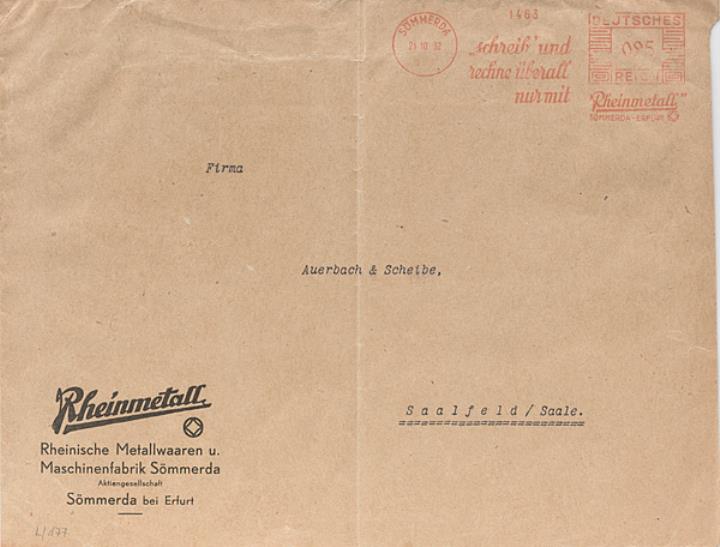 Briefumschlag mit Firmendruck und Absenderfreistempel der Rheinischen Metallwaaren u. Maschinenfabrik Sömmerda Stempel: Sömmerda/21.10.1932, Werbung Rheinmetall, Wert Deutsches Reich 95 RPf