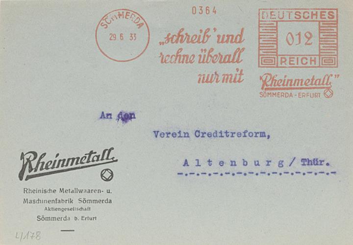 Vorderseite eines Briefumschlags mit Firmendruck und Absenderfreistempel der Rheinischen Metallwaaren u. Maschinenfabrik Sömmerda; Nr. 364 Stempel: Sömmerda/29.06.1933, Werbung Rheinmetall, Wert Deutsches Reich 12 RPf