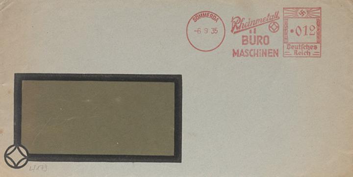 Briefumschlag mit Firmendruck und Absenderfreistempel des Schreibmaschinenherstellers Rheinmetall Stempel: Sömmerda/06.09.1935, Werbung Rheinmetall Büromaschinen, Wert Deutsches Reich 12 RPf