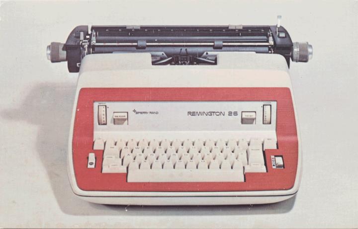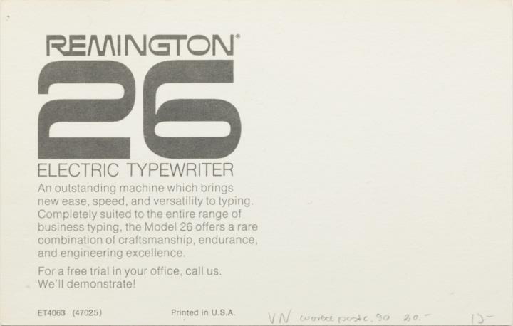Werbepostkarte; Fotografie, polychrom; Nr. ET4063 Rückseite: Schreibmaschine Remington 26 Vorderseite: Werbetext