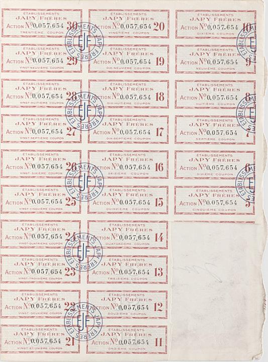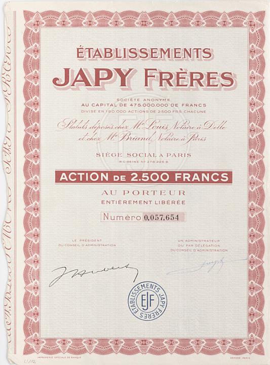 Aktie Nr. 57.654 der Japy Frères S.A. zu 2.500 Francs Mantel und Bogen mit ursprünglich 30 Kupons (vier fehlen) Druck: Imprimerie Speciale de Banque