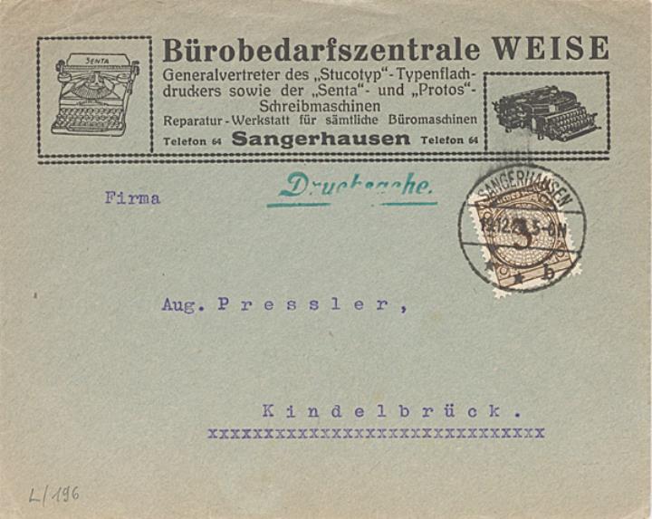 Briefumschlag mit Firmendruck der Bürowarenhandlung Weise, Sangerhausen adressiert (Maschinenschrift) an Firma Aug. Pressler, Kindelbrück; Briefmarke Deutsches Reich 3 RPf.; Poststempel Sangerhausen/19.12.1924