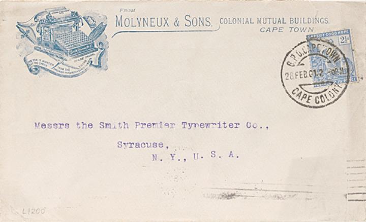 Briefumschlag mit Firmendruck der Schreibmaschinenhandlung Molyneux & Sons, Cape Town adressiert (Maschinenschrift) an Smith Premier Typewriter Co., Syracuse; Briefmarke Cape of Good Hope 2 1/2 Pence; Poststempel Cape Town/28.Feb.1901