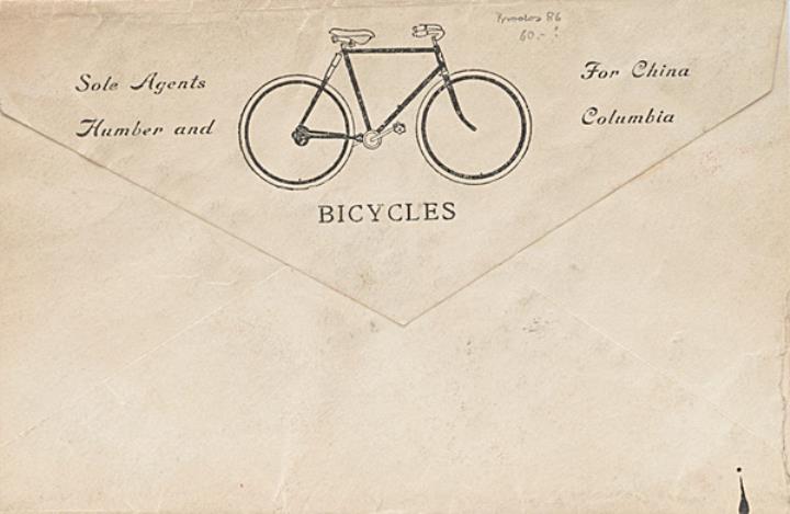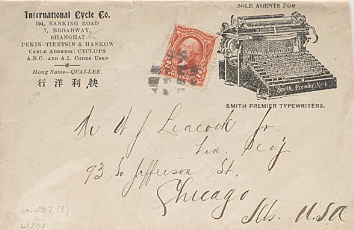 Briefumschlag mit Firmendruck der Schreibmaschinenhandlung International Cycle Co., Shanghai adressiert (Handschrift); Briefmarke U.S. Postage Two Cents; Poststempel unleserlich