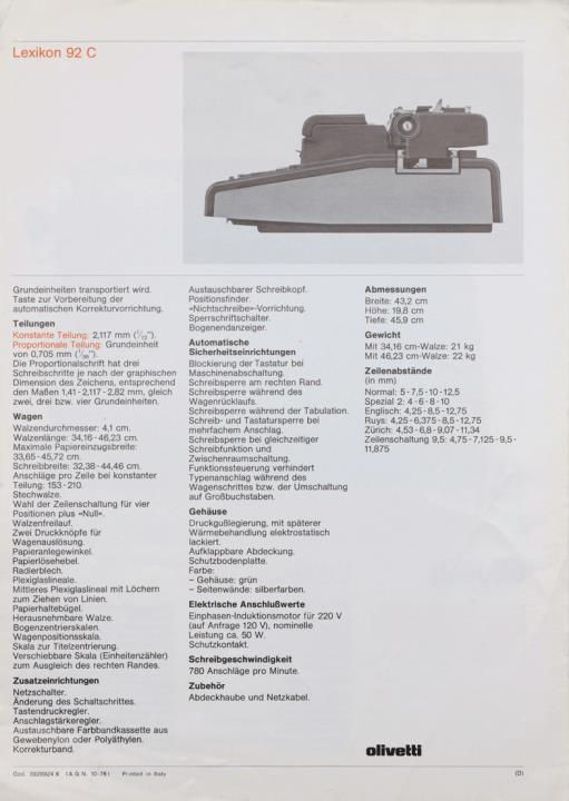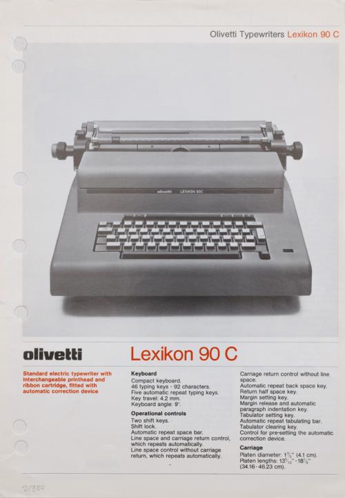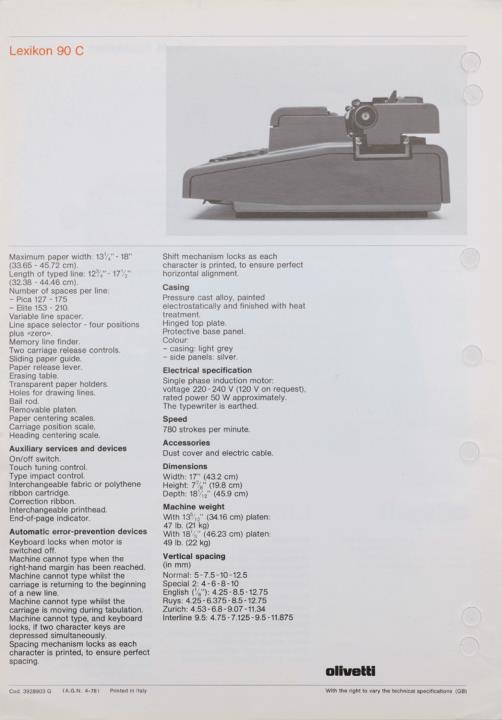 Prospekt für elektrische Büroschreibmaschine Olivetti Lexikon 90 C mit austauschbarem Schreibkopf, austauschbarer Farbbandkassette und automatischer Korrekturvorrichtung Nr. 3928903 G (AGN 4-78) GB