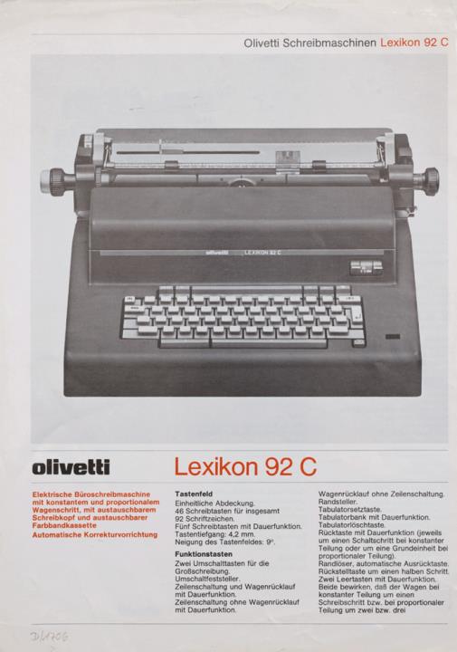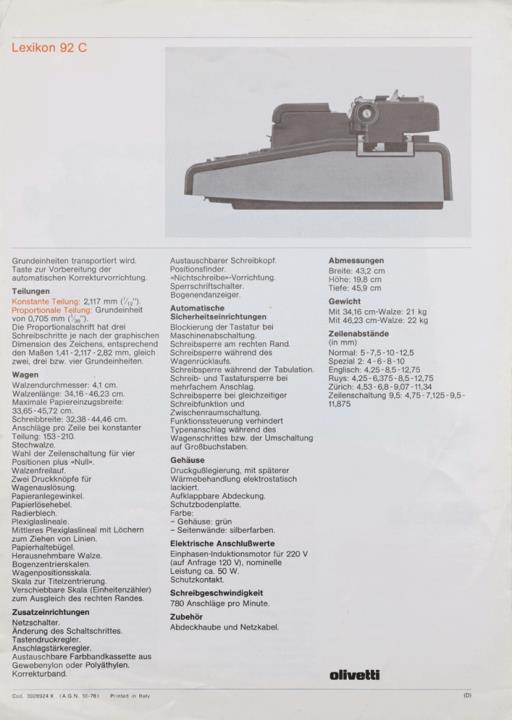 Prospekt für elektrische Büroschreibmaschine Olivetti Lexikon 92 C mit konstantem und proportionalem Wagenschritt, austauschbarem Schreibkopf, austauschbarer Farbbandkassette und automatischer Korrekturvorrichtung Nr. 3928924 K (AGN 10-76) D
