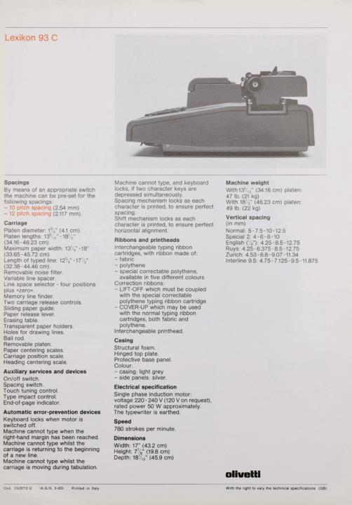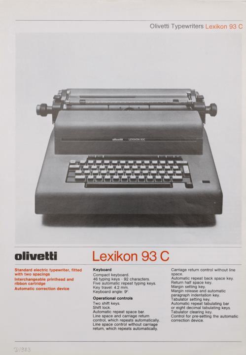 Prospekt für elektrische Büroschreibmaschine Olivetti Lexikon 93 C mit zweifachem Wagenschritt, austauschbarem Schreibkopf, austauschbarer Farbbandkassette und automatischer Korrekturvorrichtung Nr. 3928113 U (AGN 3-80) GB