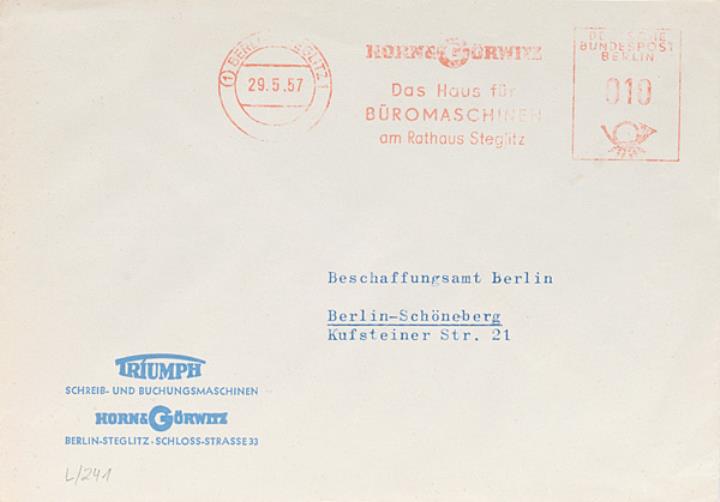 Briefumschlag mit Firmendruck und Absenderfreistempel der Schreibmaschinenhandlung Horn & Görwitz, Berlin adressiert (Maschinenschrift) an Beschaffungsamt Berlin Stempel: Berlin/29.05.1957, Wert Deutsche Bundespost Berlin 10 Pf.