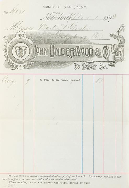 Brief (Monatsaufstellung) der John Underwood & Co., New York ausgestellt (Handschrift) auf Mr. Winter, Gettysburg mit dazugehörendem Briefumschlag