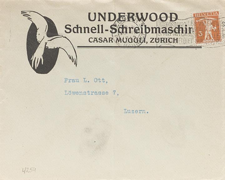 Briefumschlag mit Firmendruck der Schreibmaschinenhandlung Cäsar Muggli, Zürich adressiert (Maschinenschrift) an Frau Ott, Luzern; Briefmarke Helvetia 3 Rp., Poststempel Zürich/25 VI 191x