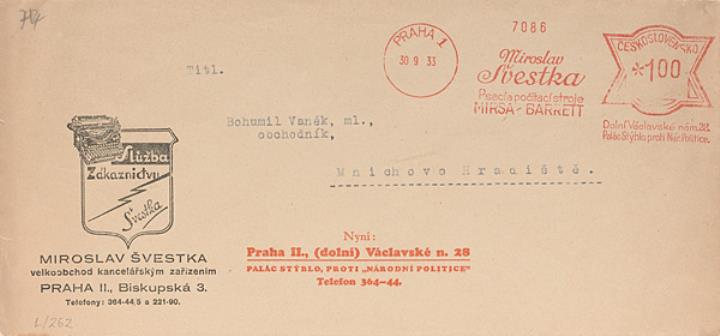 Briefumschlag mit Firmendruck und Absenderfreistempel der Schreibmaschinenhandlung Miroslav Svestka, Prag; Nr. 7086 adressiert (Maschinenschrift) Stempel: Prag/30.09.1933, Wert Ceskoslovensko 100 H