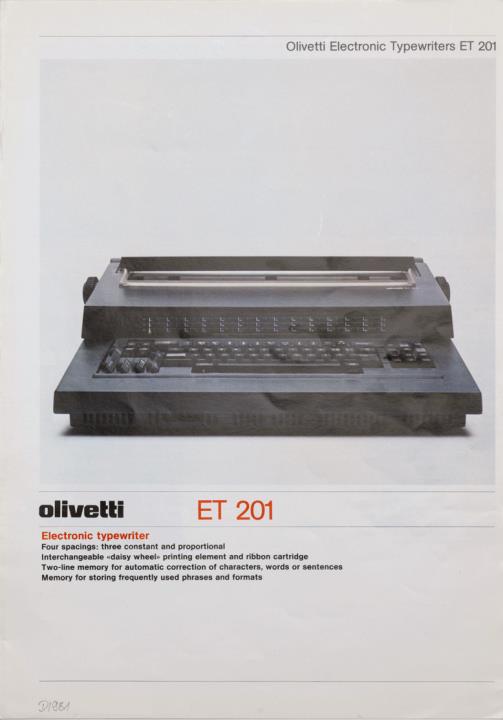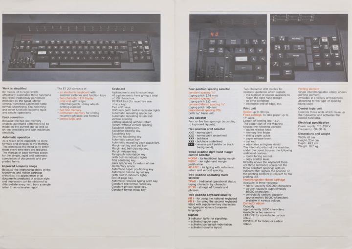 Faltprospekt für elektronische Schreibmaschine Olivetti ET 201 Vier Wagenschritte, Typenrad und Farbband-Kassetten austauschbar, Zwei-Zeilen-Speicher für die automatische Korrektur, Speicher Nr. 3925143 S (AGN 4-79) GB