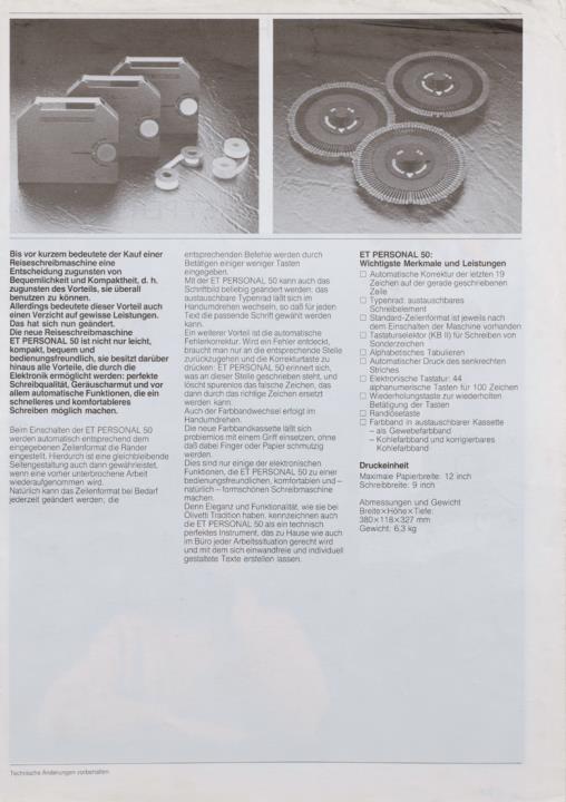 Prospekt für elektronische Schreibmaschine Olivetti ET Personal 50