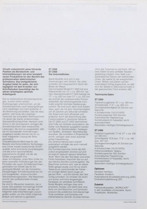Prospekt für elektronische Schreibmaschine Olivetti ET 2200 und ET 2400 Nr. 4/88