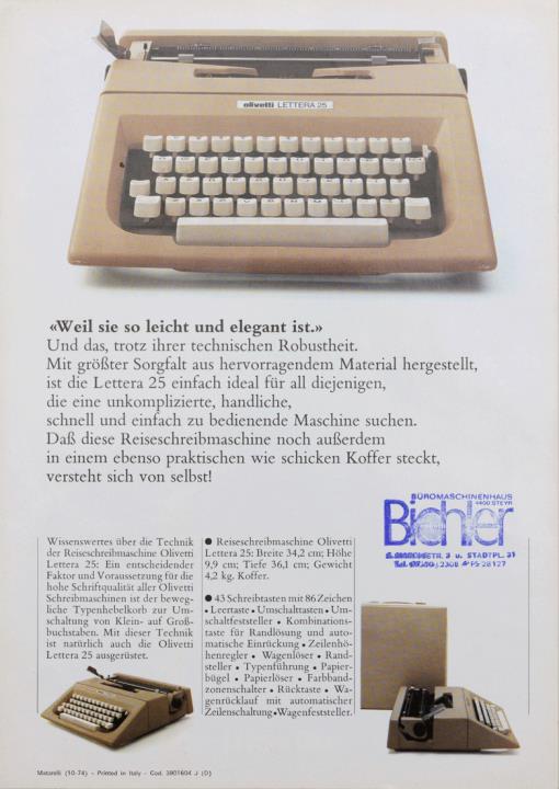Prospekt für Reiseschreibmaschine Olivetti Lettera 25 Warum wohl geht unsere Olivetti Lettera 25 so gern auf Reisen? Nr. 10-74 / 3901604 J (D)