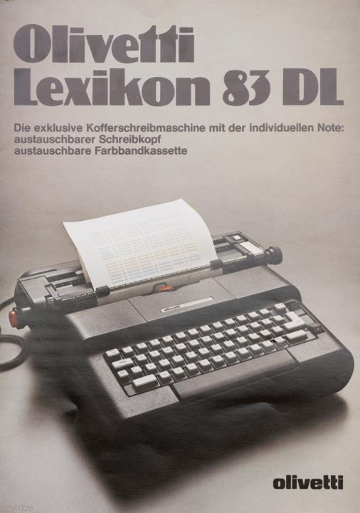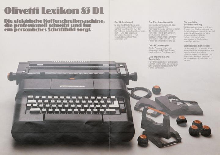 Faltprospekt für elektrische Schreibmaschine Olivetti Lexikon 83 DL Die exklusive Kofferschreibmaschine mit der individuellen Note Nr. 12-76 / 3902114 H (D)
