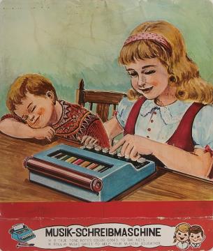 Konvolut: ein Verpackungsdeckel, ein Liederheft in deutscher Sprache und ein Notenblatt in englischer Sprache für Glockenspiel Musik-Schreibmaschine