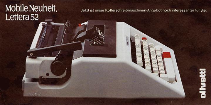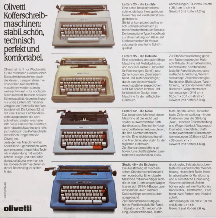 Faltprospekt für Kofferschreibmaschinen Olivetti Nr. 09/057/SM/80