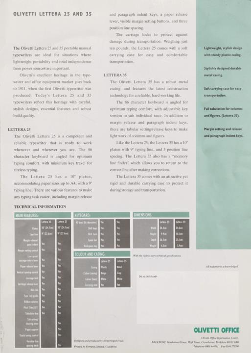 Prospekt für Reiseschreibmaschine Olivetti Lettera 25 und 35 The stylish and compact fully portable manual typewriters