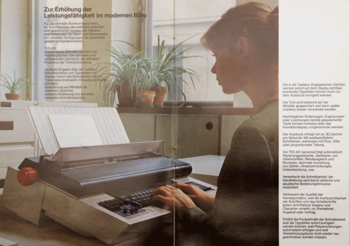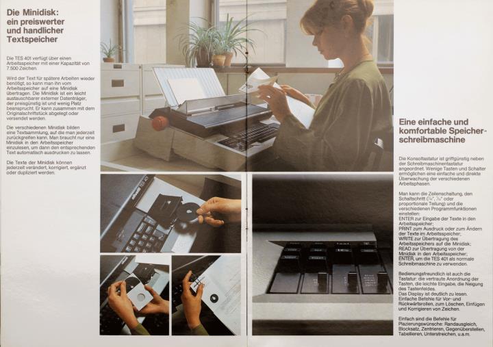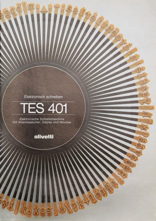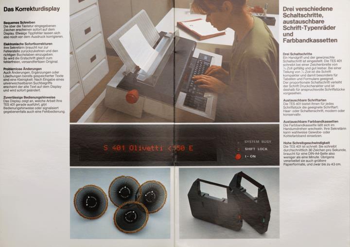 Prospekt für elektronische Speicherschreibmaschine Olivetti TES 401 mit Arbeitsspeicher, Display und Minidisk Nr. 10-79 / 3902134 B (D)