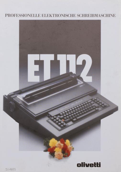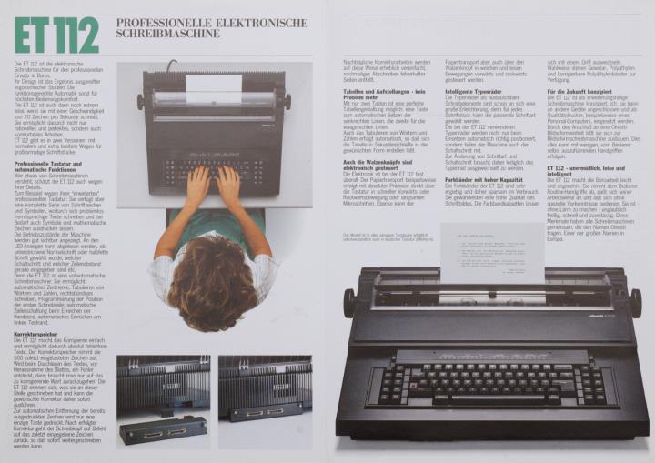 Faltprospekt für Schreibmaschine Olivetti ET 112 Professionelle elektronische Schreibmaschine Nr. 3907604 T/03/050/ET/86 (D) / 1-86
