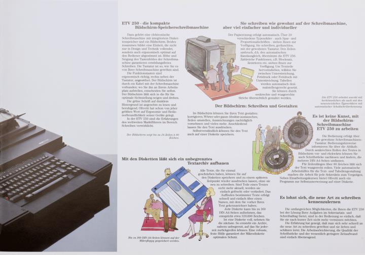 Faltprospekt für Schreibmaschine Olivetti ETV 250 Elektronische Bildschirmschreibmachine mit Diskettenlaufwerk Nr. 3907494 U (D) / 7-85